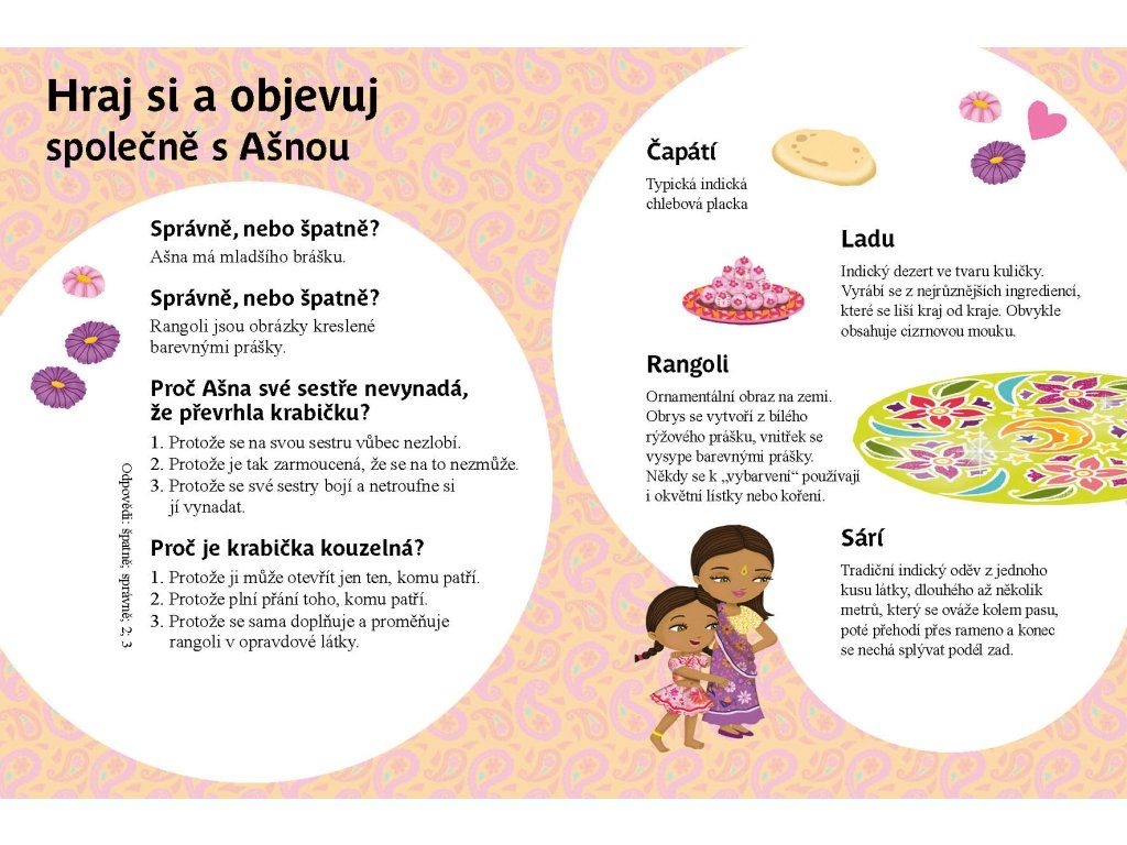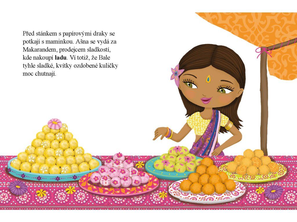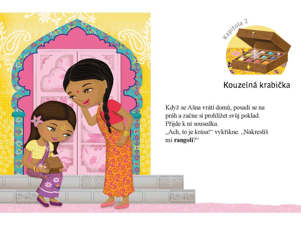 Ašna žije se svými rodiči v Indii. Každý týden pomáhá prodávat na trhu – za odměnu pak dostane peníze, které tu může utratit. Jednoho dne ji upoutá zvláštní stánek, kde se skví hromádky barevných prášků na rangoli, krásné obrazce, které se kreslí na zem před domem, aby nosily štěstí. Ašna si koupí krabičku plnou barevných prášků a začne tvořit nádherné vzory, které se mění v překrásné pestrobarevné látky. A to není všechno, co její kouzelná krabička s prášky dokáže!