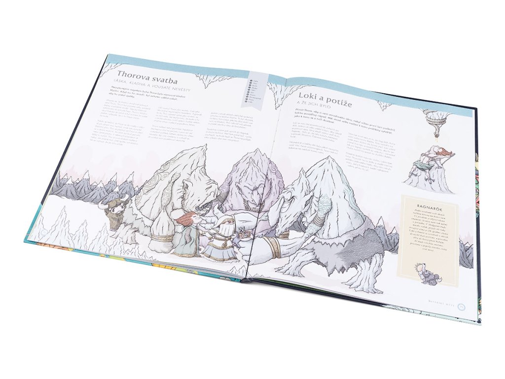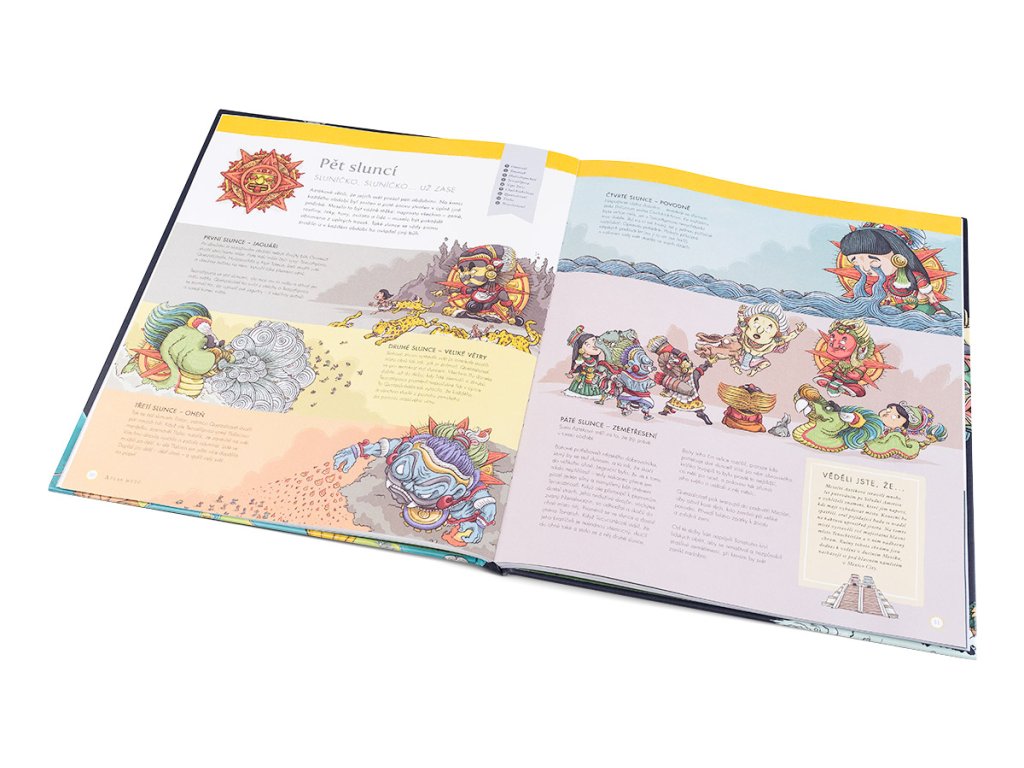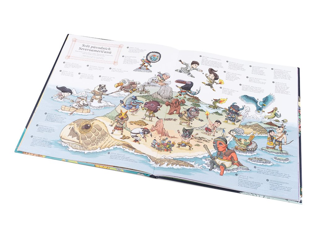 Když si budete mapy prohlížet a číst příběhy, které je doprovázejí, procestujete zeměkouli křížem krážem. Poznáte, jaké legendy si vyprávěli původní obyvatelé severní Ameriky, jak nahlíželi na svět a jeho stvoření příslušníci úžasné civilizace Aztéků nebo domorodý kmen Janomamů v Amazonii. Hlouběji se seznámíte s řeckými mýty, dobře známými přinejmenším v celé Evropě, ale proniknete i do magického světa irských, severských či slovanských bohů. V Africe vás pohltí přízračný jorubský svět nebo rovněž světoznámé mýty starých Egypťanů. V Asii vám pak učarují hinduistické a japonské legendy a v Oceánii svět polynéských domorodých kultur.