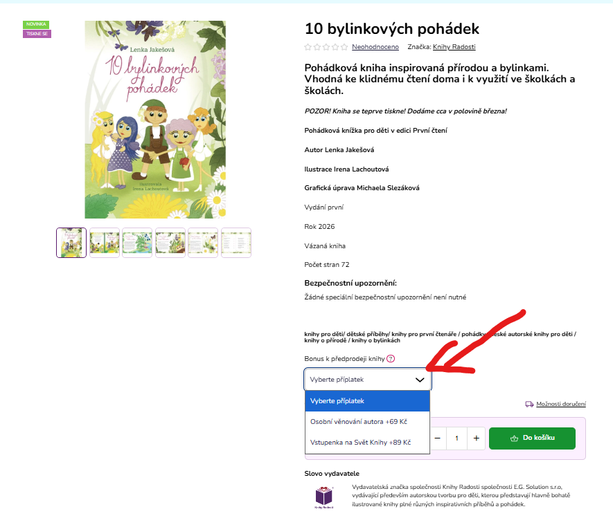 Přidáváme malý návod jak zakoupit ke knize bonusy. Srolujte k možnosti přidat do košíku a vyberte bonus ke knize (červená šipka)