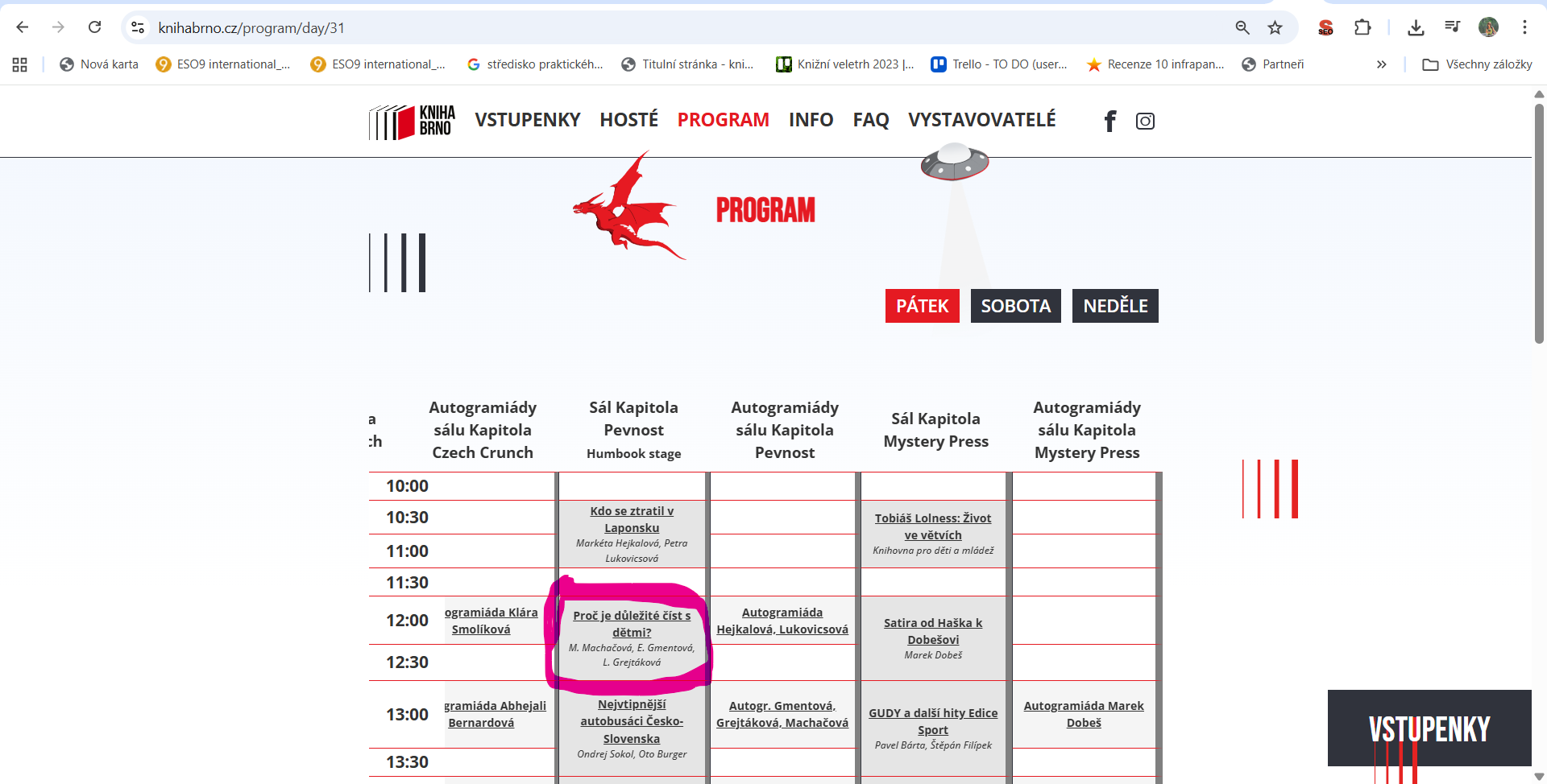 Potkáte se na ní i s námi, s Knihami Radosti, a s našimi knihami a autorkami. V pátek přesně ve dvanáct hodin v sále Kapitola Pevnost budeme diskutovat o tom Proč je důležité číst s dětmi. Nebojte se, že budeme někoho poučovat, spíše budeme se čtenáři sdílet vlastní zkušenosti matek a babiček, co píší pro děti a dětem čtou. Na besedě a poté i na autogramiádě a na stánku, se budete moci potkat s našimi autorkami Martinou Macháčovou, která u nás vydala knihu Tajemství ježčích zahrad, s Lucií Grejtákovou, slovenskou křehkou vílou, co ilustruje a píše knihy, u nás jí vyšla v překladu kniha Píšťalkou mě zavoláš, a s sebou přiveze i novinku Hněvko a Láska, a mojí maličkostí Evou Gmentovou, která začala vydávat knihy proto, že chtěla s vnuky číst knihy, které ji baví a jejíž Mašinku Modřinku děti milují. Dále se potkáte s naším stálým moderátorem Jakubem Večeřou, kterého znáte jak z rádia, festivalu Knižní Radosti, tak z TV11.