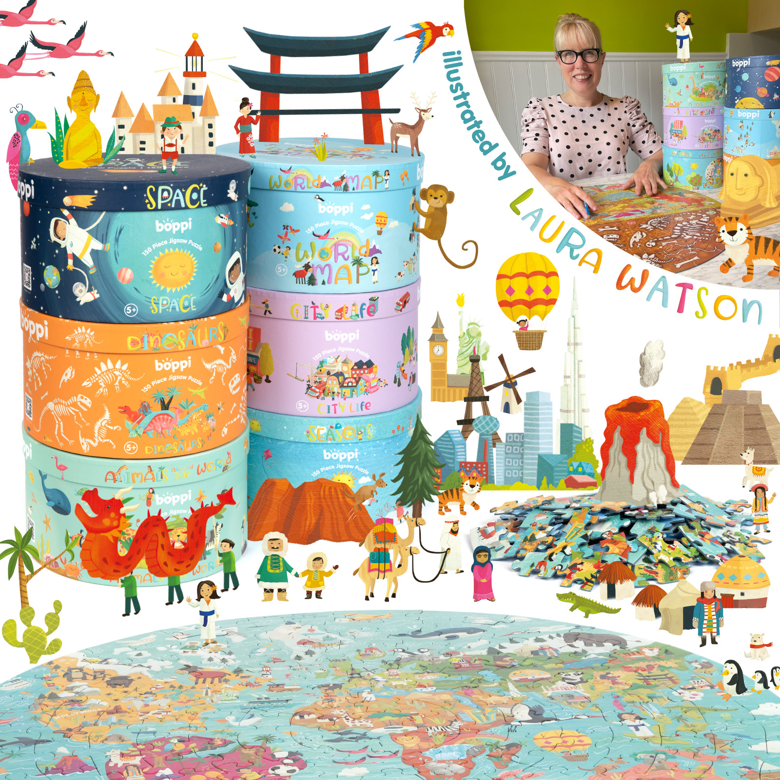Puzzle boppi rezonují s naším vnímáním barevného veselého dětského světa plného kouzelných postaviček lidí i zvířat, jež nenápadně a laskavě děti vzdělává.