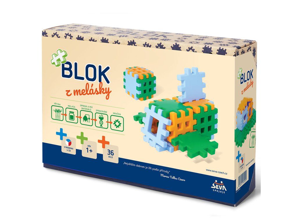Stavebnice BLOK z melásky. Jsem z cukrové třtiny, jsem recyklovatelný... jsem prostě zelený. Stavebnice obsahuje 36 dílů.