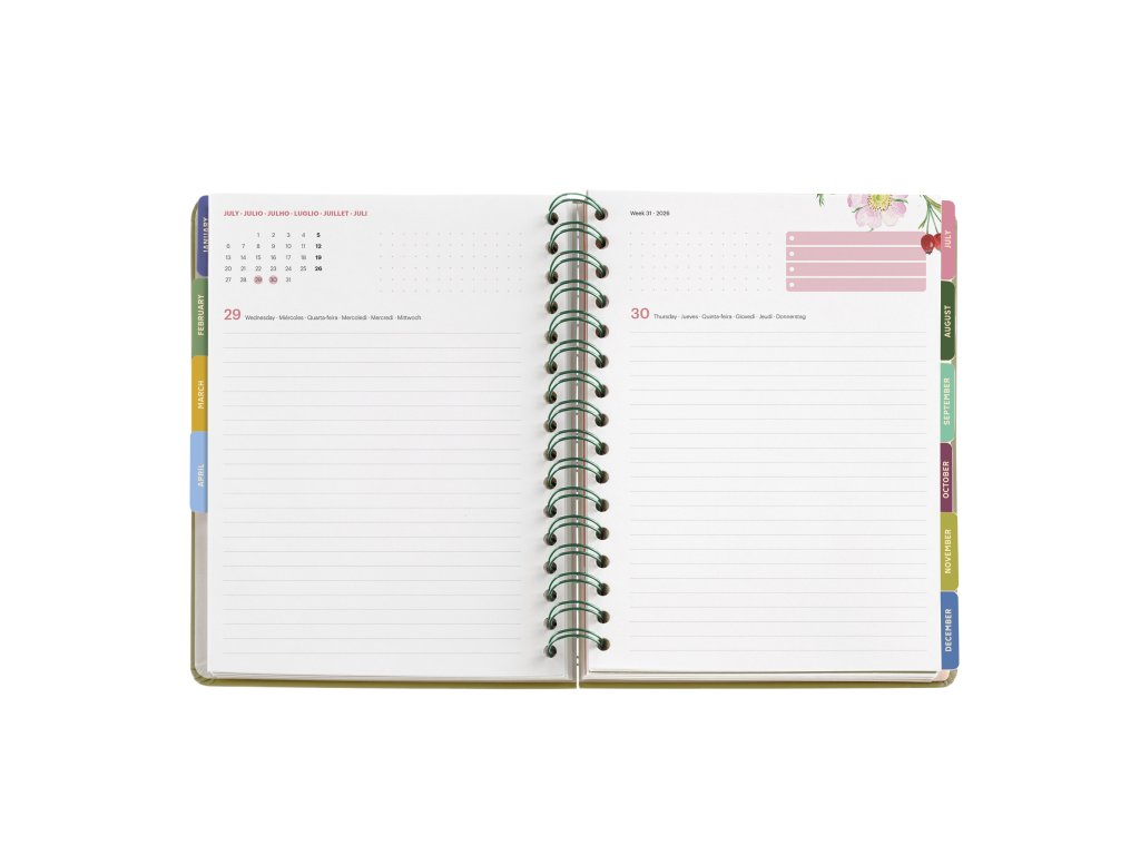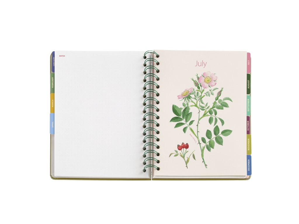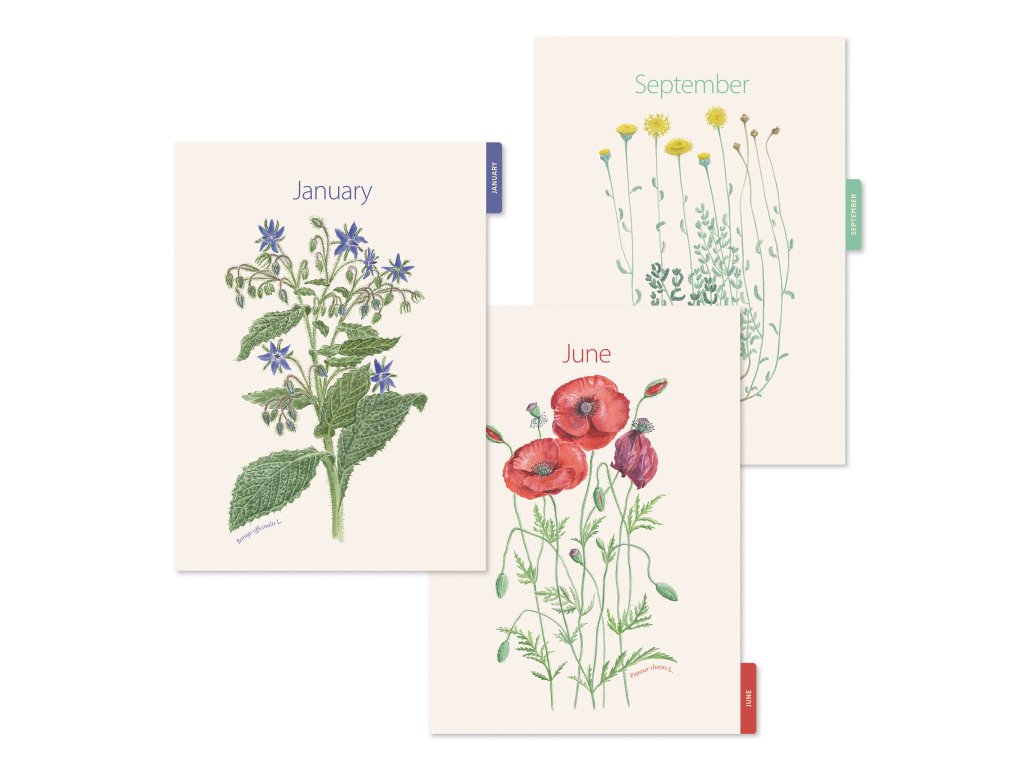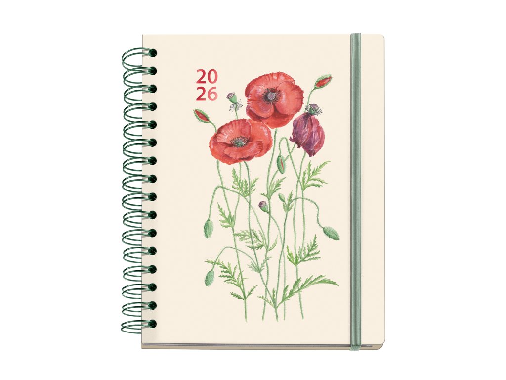 Diář Vlčí máky od MiguelRius obsahuje rozdělení na jednotlivé měsíce tvrdými deskami s obrázky lučních květin