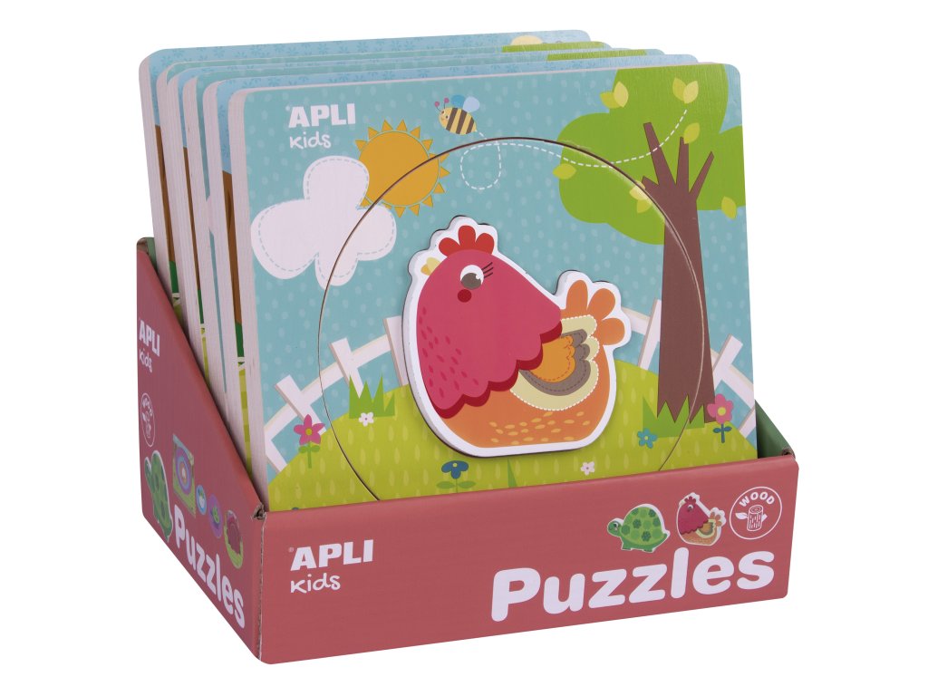 Model: Kuře. Velikost 198 x 198 x 18 mm. Každá skládačka je vytištěna plnobarevně a obsahuje vodítko vytištěné na základně, které usnadní aktivitu těm nejmenším