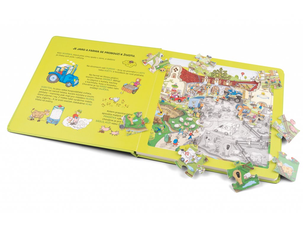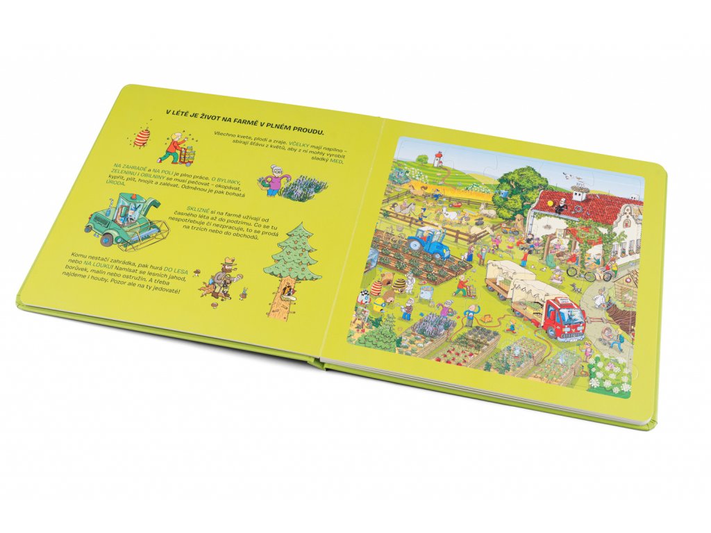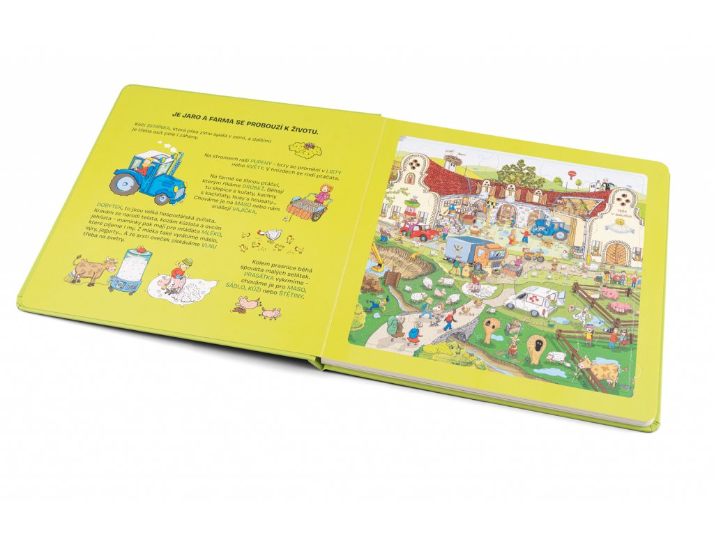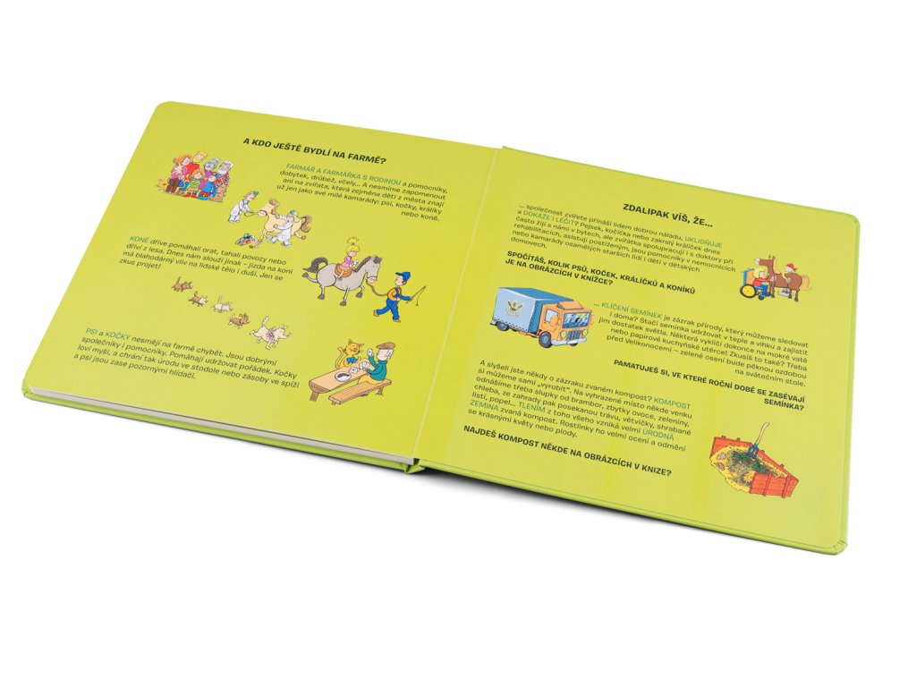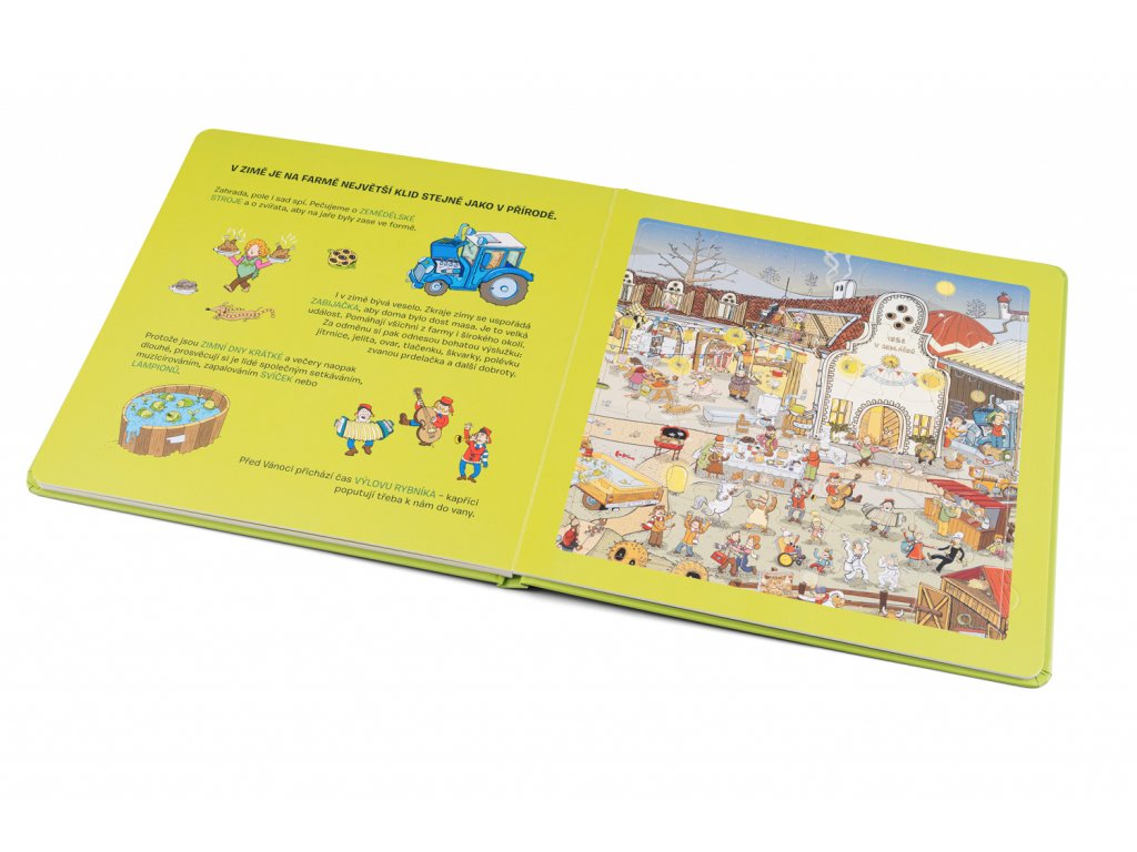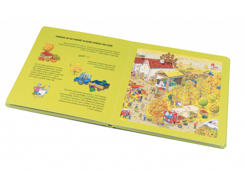 V této zábavné knížce plné roztomilých postaviček a vtipných scén podrobně seznámíte se životem na farmě od jara do zimy. Na jaře se rodí mláďátka a všechno kvete, v létě je třeba věnovat se hlavně poli a zahradě a na podzim hurá do sadu! Ani v zimě, kdy příroda spí, na statku nezahálejí… Dozvíte se, odkud se bere med, mléko a vajíčka nebo z čeho se vyrábějí svetry. Poznáte, kolik práce je třeba, aby vyrostlo obilí, jak se starat o bylinky, ovoce a zeleninu. A také jaké dobroty nám dává příroda a co z nich zvládnou vykouzlit šikovní farmáři!