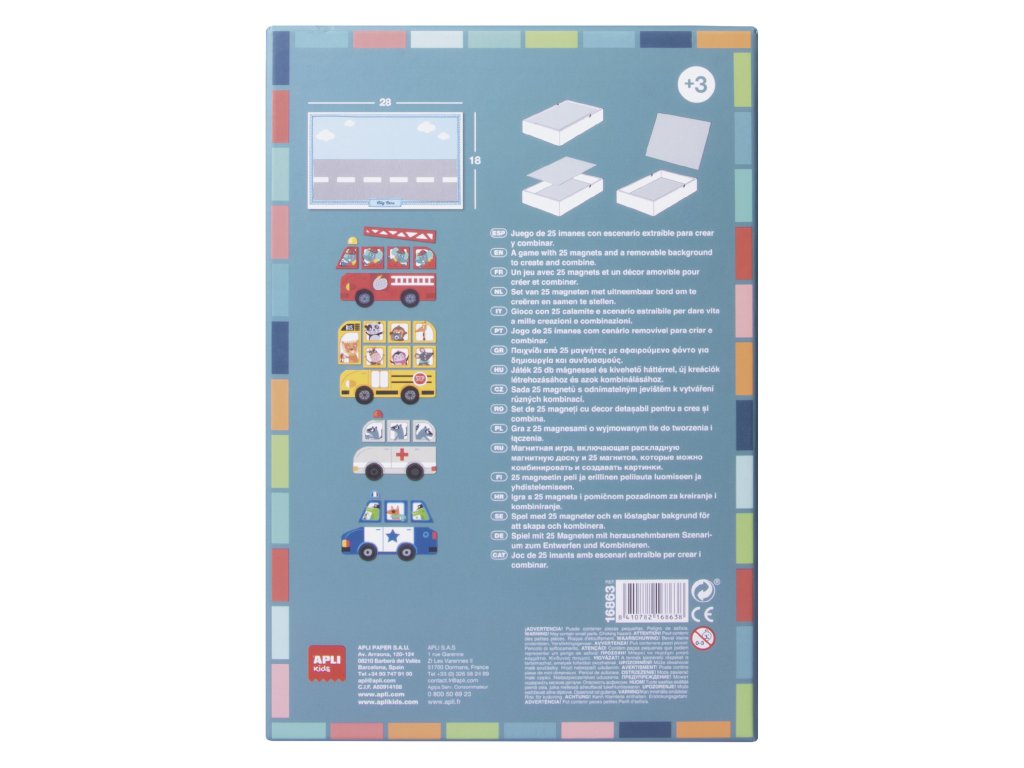 Každá sada obsahuje: 1 magnetický stolek o rozměrech 28 x 18 cm, který se vejde na dno krabice, a 25 magnetických žetonů s různými díly vozidla.