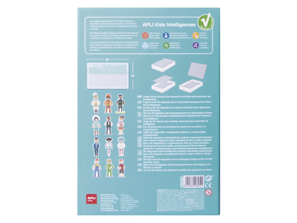 Hra obsahuje 1 magnetizovaný stolek 28 x 18 cm, který se hodí na základna krabice a 36 magnetů s různými pracovními oděvy