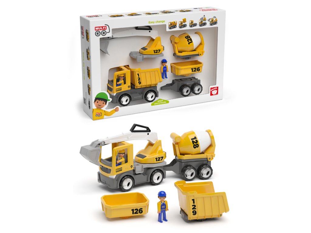 Stavební sada BEDI nabízí 4 typy vozidel v jednom balení. Ideální balení pro kreativní děti, které rozehrávají svou hru na stavbaře. Sada obsahuje jedno auto, 2 Igráčky stavbaře a 4 korbičky: bagr, domíchávač, sklápěčku a valníček.