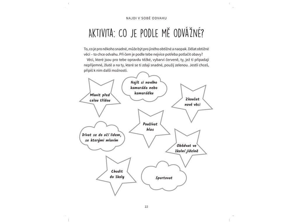 Se stydlivostí a s úzkostmi se potýká vysoké procento populace. Pro děti (a jejich rodiče) bývá často obtížné se s tímto problémem vypořádat. Je velmi důležité, aby se děti cítily respektované a vnímaly, že je okolí bere takové, jaké jsou, a aby jim byly citlivým a zábavným způsobem nabídnuty techniky, které jim pomohou rozvíjet důvěru v sebe sama. Přesně to nabízí kniha Najdi v sobě odvahu od Poppy O’Neill. Dětem i jejich rodičům představuje jednoduché postupy, které napomáhají rozvoji sebevědomí.