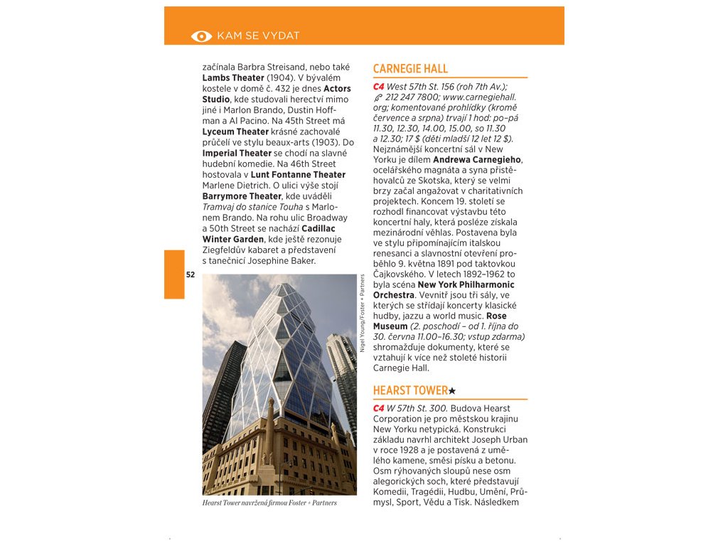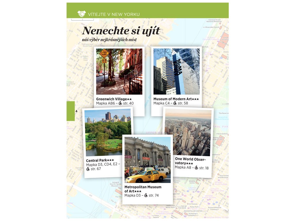 Zajeďte si do země filmových hvězd! Objevujte město zevnitř s newyorskými dobrovolníky nebo cestujte sami. Užijte panoramatický výhled z paluby vrtulníku nebo ze střechy autobusu. Zatoulejte se v Central parku nebo si zajděte si na koncerty a balety zdarma. Pochutnejte si na specialitách nebo podlehněte nákupní horečce. Kosmopolitní New York má zkrátka každému co nabídnout. Autoři pro vás vybrali to nejzajímavější.