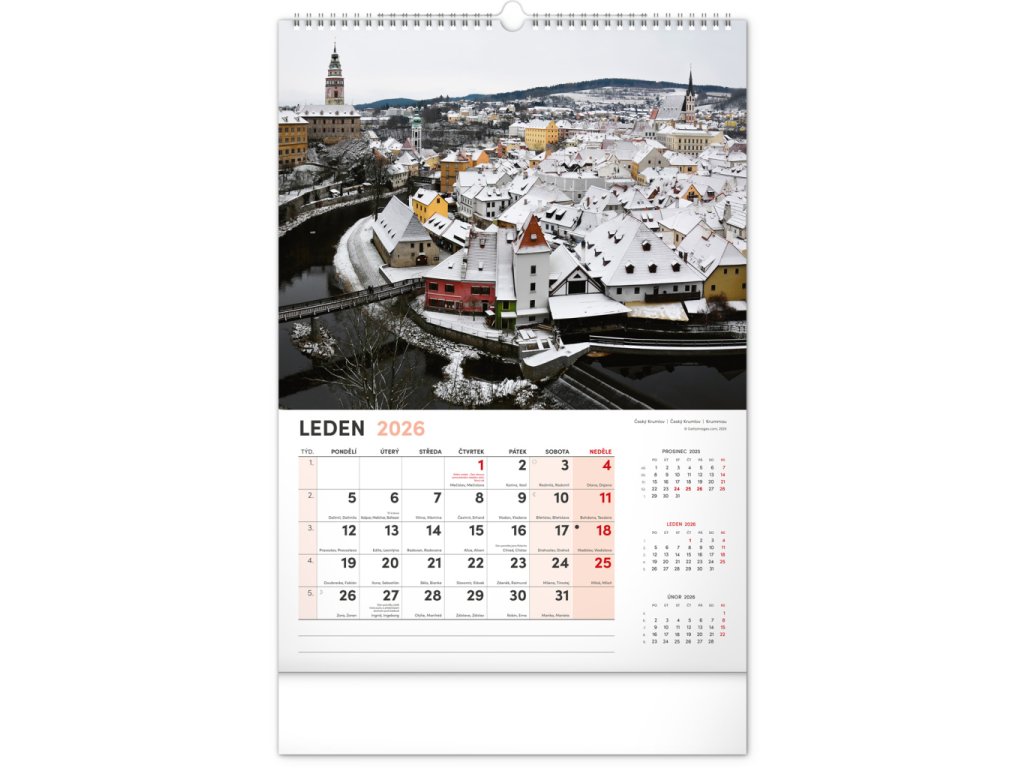 Kalendář s fotografiemi z nejkrásnějších míst České republiky. Praha, Kutná Hora, Olomouc a další skvosty v kalendáři s tématem Má vlast ve výškovém formátu s popisky a jednoduchým kalendáriem.