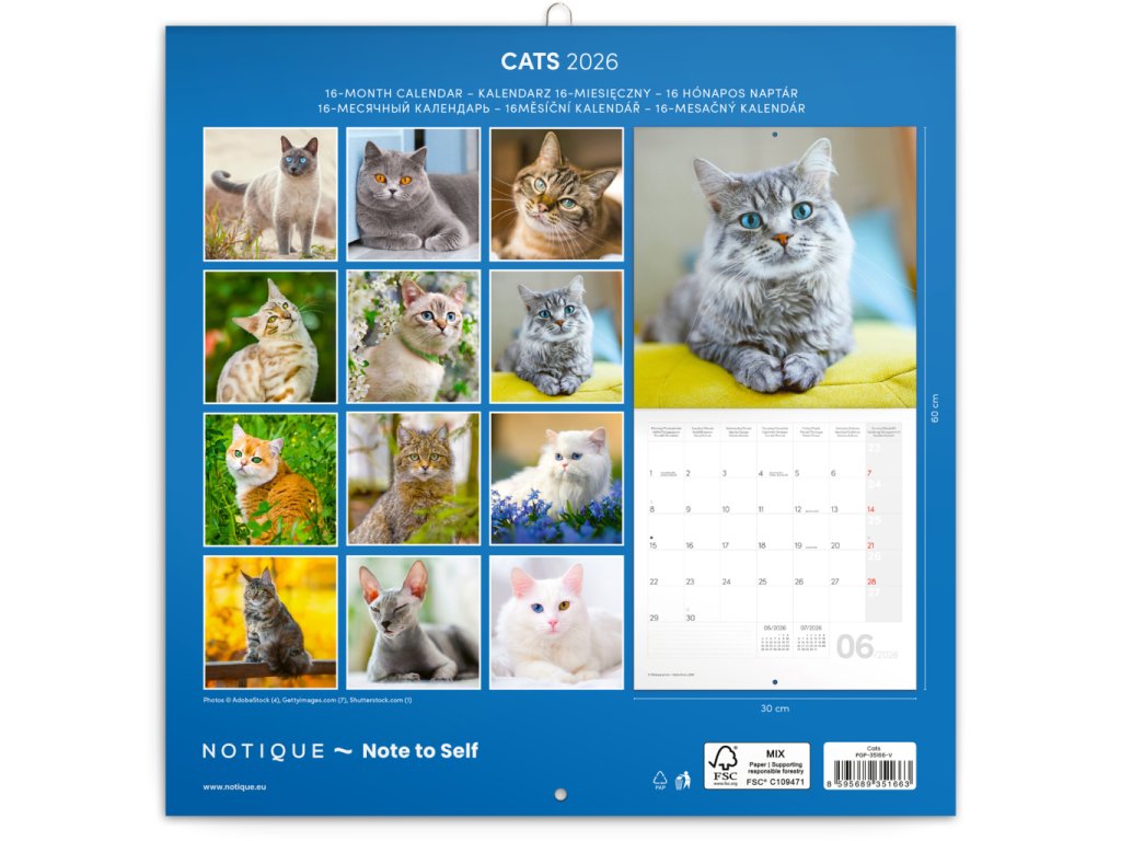 NOTIQUE Poznámkový kalendář Kočky 2026, 30 x 30 cm
