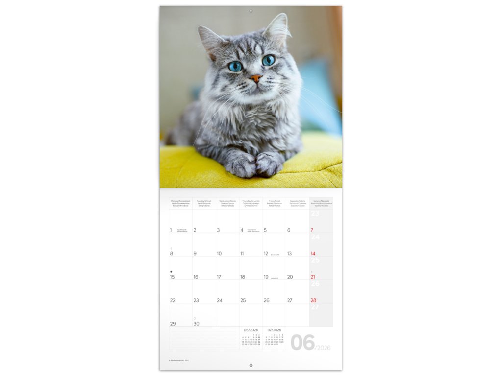 Poznámkový kalendář pro milovníky chlupatých kočičích přátel a jejich komplikovaných osobností. Šestijazyčné kalendárium nabízí dost prostoru pro vaše poznámky a plány, dále obsahuje měsíční fáze a důležité svátky.