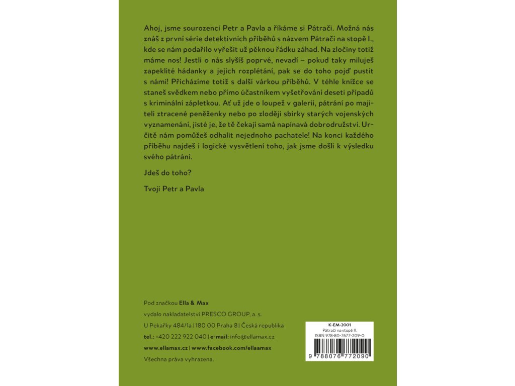 Pusťte se do rozplétání zapeklitých hádanek a detektivních případů společně se sourozenci Petrem a Pavlou, kteří si říkají Pátrači. Je jim teprve osm a dvanáct let, ale podařilo se jim už vyřešit pěknou řádku záhad. Na zločiny totiž mají nos! V téhle knížce se stanete svědky nebo přímo účastníky vyšetřování deseti případů s kriminální zápletkou. Ať už jde o loupež v galerii, pátrání po ukradené sbírce vojenských artefaktů nebo po fantomovi z koupaliště, jisté je, že vás čekají samá napínavá dobrodružství. Na konci každého příběhu najdete i logické vysvětlení toho, jak sourozenci došli k výsledku svého pátrání.