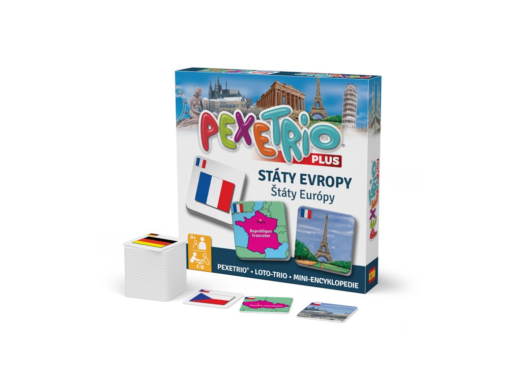 Pexetrio STÁTY EVROPY je zábavná hra inspirovaná pexesem, která děti zároveň i vzdělává. Děti se naučí vlajky, mapky a stavební památky daného státu podle hesla „škola hrou“. Kromě toho, že si děti osvojí státy Evropy zábavným způsobem, hra také napomáhá rozvíjet jejich logické myšlení a trénovat paměť hledáním trojice kartiček s vlajkou, mapkou a stavební památkou stejného státu.