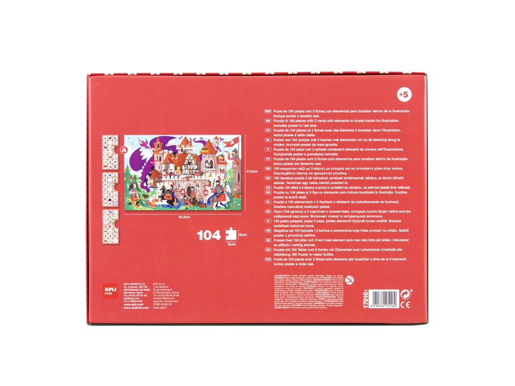 Postřehové puzzle s tématikou hradu. Obsahuje 104 kusů o velikosti 5 x 5 cm. Velikost puzzle: 64,5 x 41,5 cm.