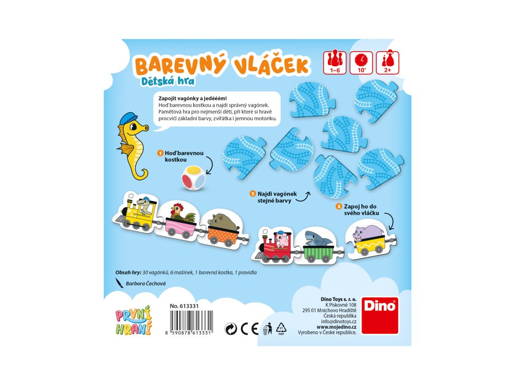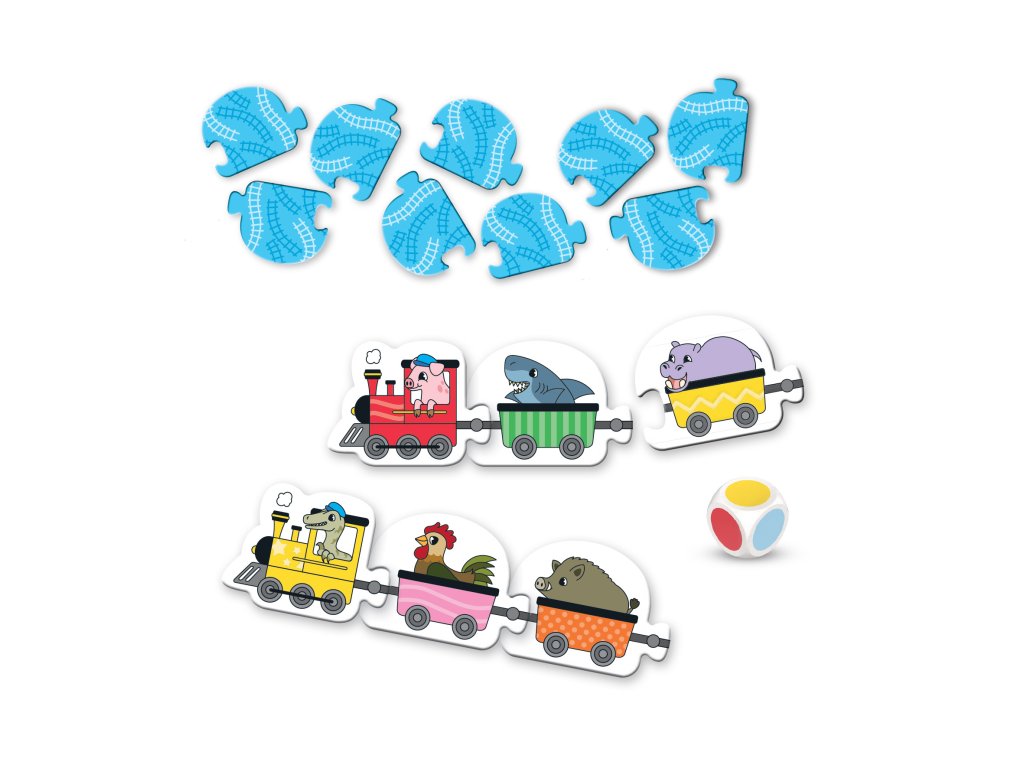 Hodit kostkou, zapojit správné vagónky za mašinku a vyrazit po kolejích za dobrodružstvím! S Barevným vláčkem hravou formou trénujete u dětí paměť, rozlišování barev a naučíte je rozpoznávat různé druhy zvířátek. Jak hrát? Každý z hráčů si vybere svou mašinku. Všechny vagónky se zamíchají a položí lícem dolů na stůl. Hráč hodí barevnou kostkou a snaží se najít vagónek stejné barvy. Pokud se mu to povede, zapojí vagónek do svého vláčku. Komu se podaří zapojit pátý vagónek jako první, vítězí! Hra nabízí i další varianty – pro úplně nejmenší děti bez nutnosti soutěžení, nebo variantu s hledáním zvířátek místo barev.