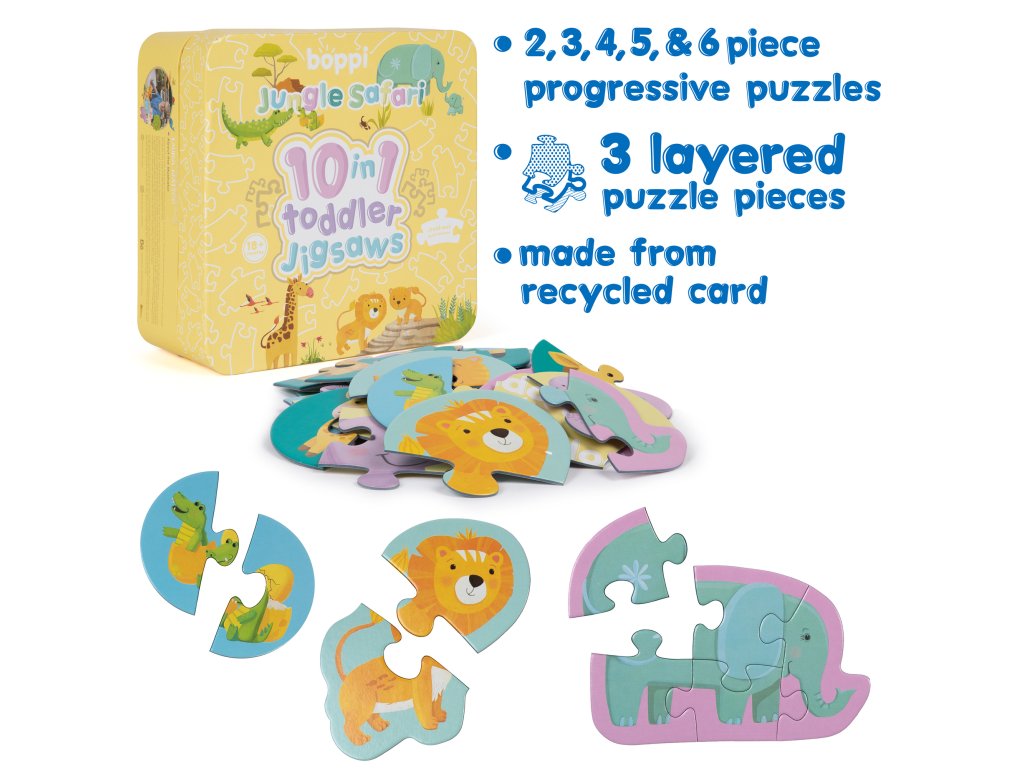Tematická sada boppi pro batolata od 18-ti měsíců obsahuje 6 x 2, 1 x 3, 4, 5 a 6 kusové puzzle a jednu desku poskytující pozadí pro skládání. 100% recyklovatelné. Vyrobeno z ekologických materiálů.
