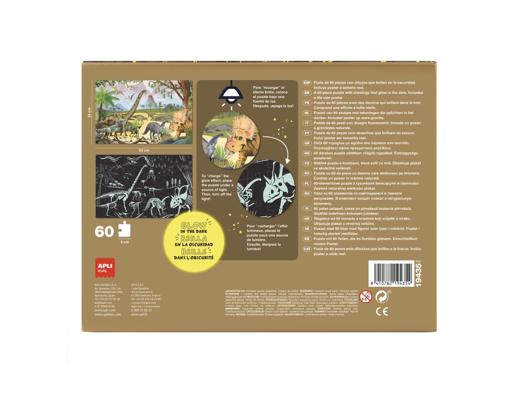 Fluorescenční puzzle "Svítí ve tmě" s dinosauří tématikou. Obsahuje 60 dílků o rozměru 6 x 6 cm.