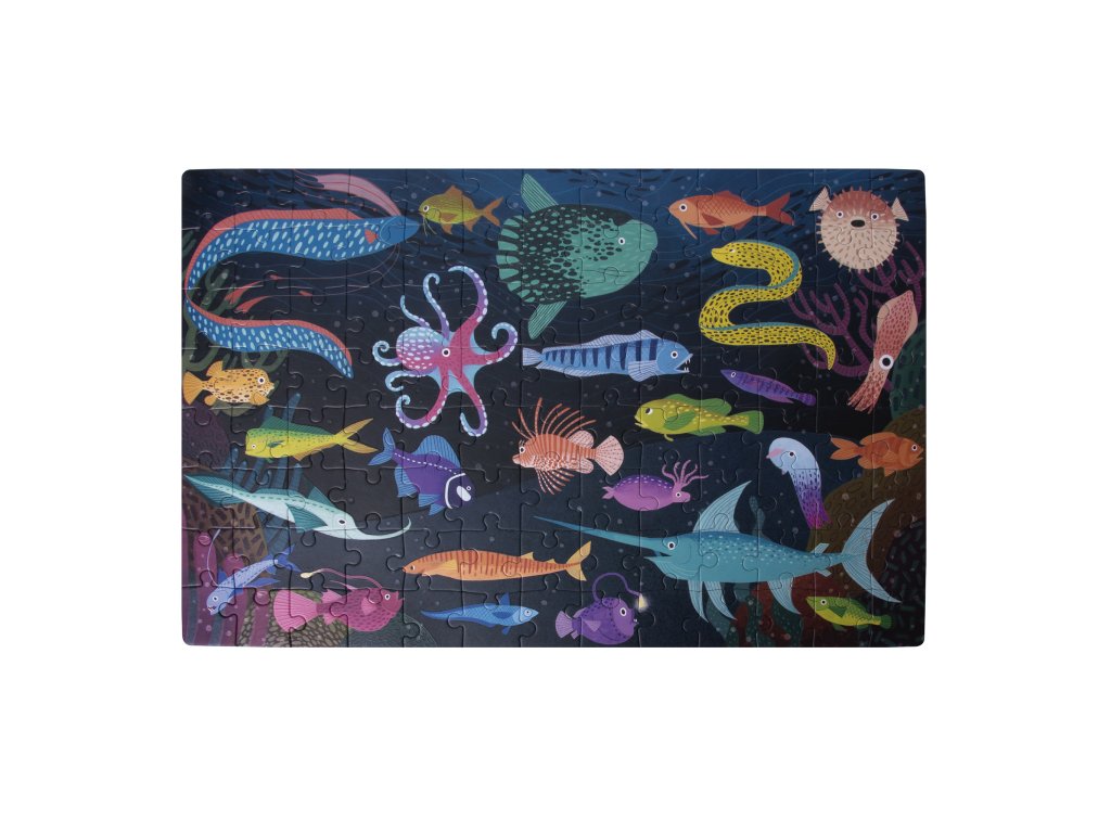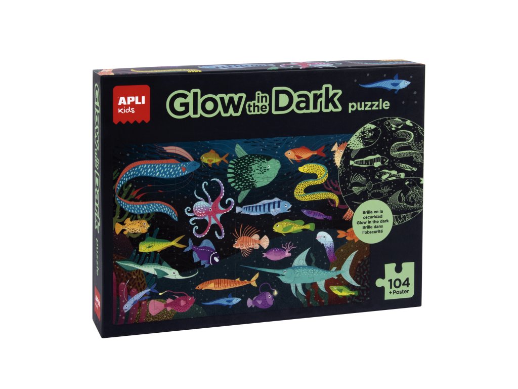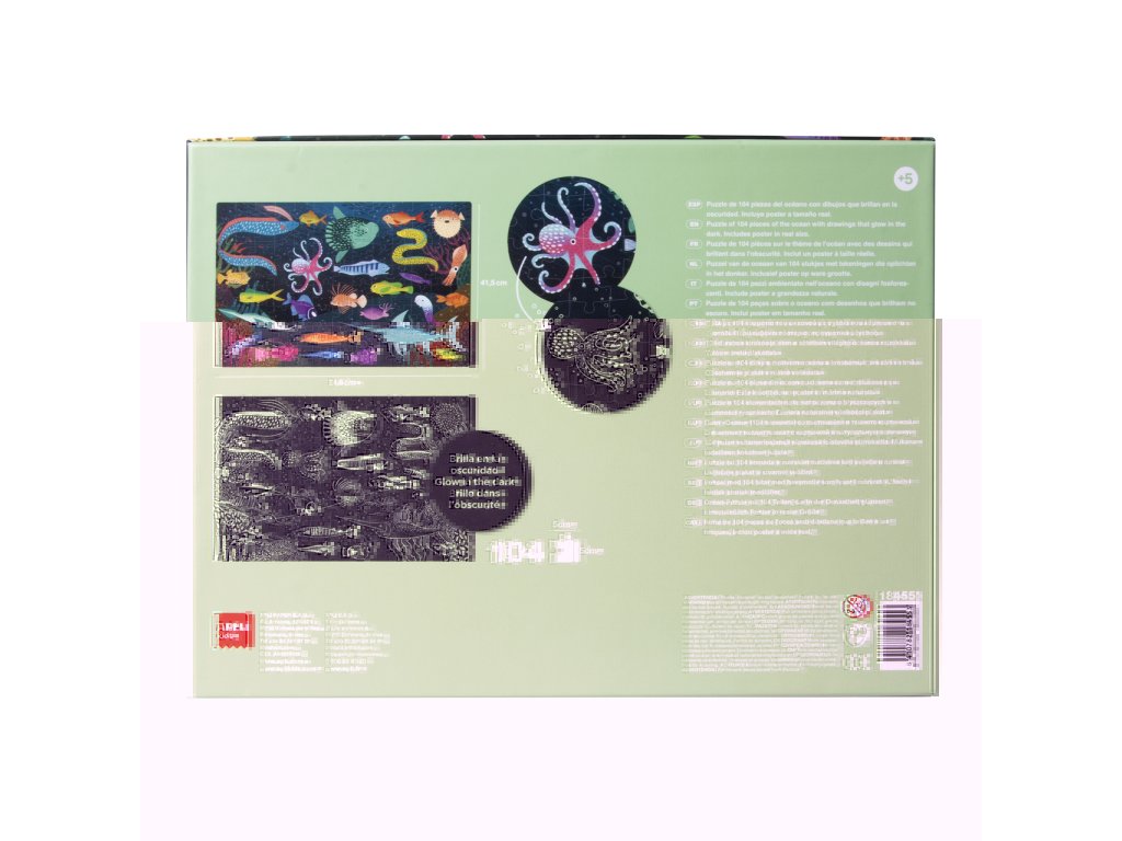Fluorescenční puzzle "Svítí ve tmě" s tématikou oceánu. Obsahuje 104 dílků o rozměru 5 x 5 cm. Velikost puzzle: 64,5 x 41,5 cm.
