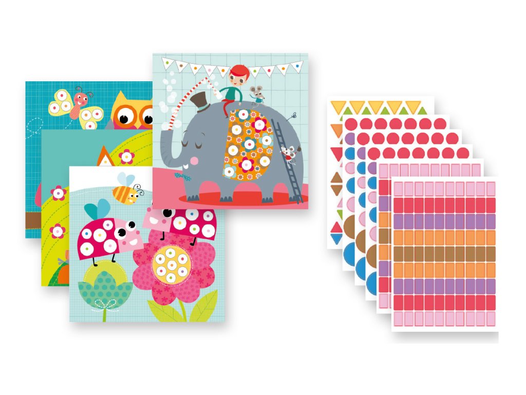 Sada obsahuje: 16 listů k vyplnění samolepkami (8 návrhů, 2 listy od každého návrhu), 10 listů odnímatelných samolepek geometrických tvarů v různých barvách a průvodce s příklady barev.