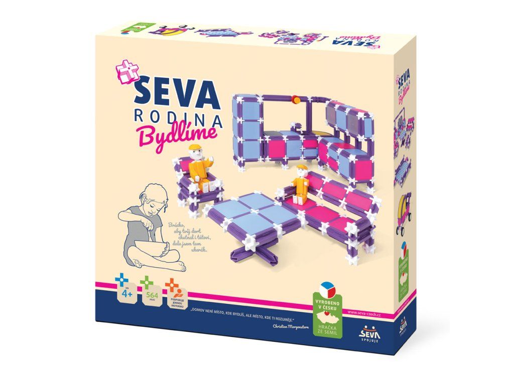 Stavebnice SEVA RODINA - Bydlíme obsahuje 564 dílků, ze kterých si můžete sestavit např. kuchyň, ložnici, obývací pokoj, kočárek, panáčky Seváčky, atd.