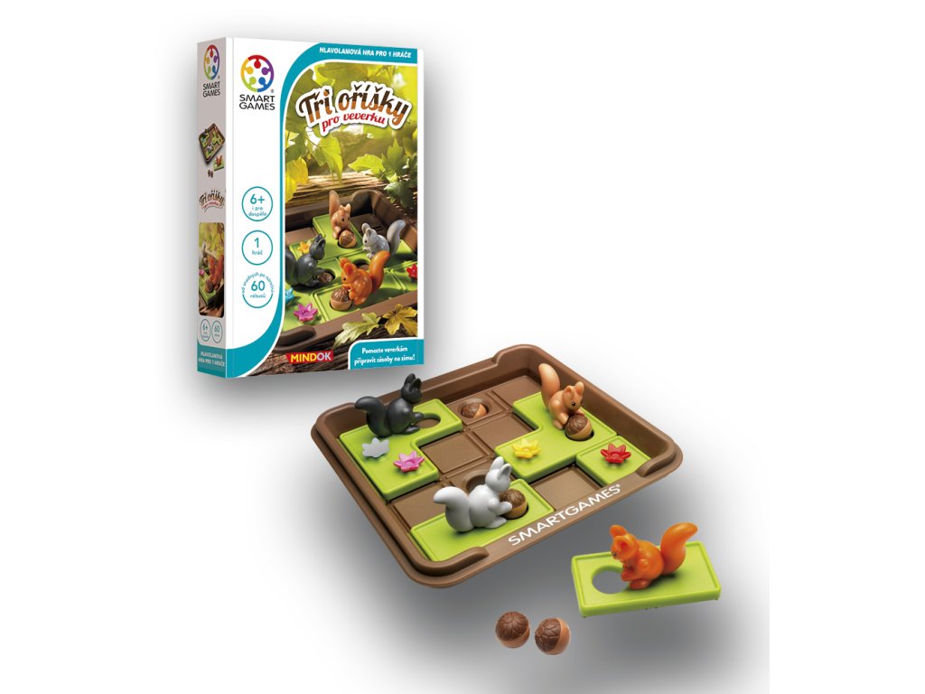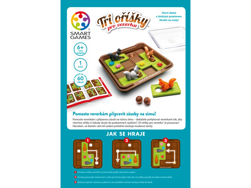 Pomozte veverkám připravit zásoby na zimu! Pomozte veverkám s přípravou zásob na tuhou zimu – dokážete pohybovat veverkami tak, aby všechny oříšky či žaludy skryly do podzemních spižíren? „Tři oříšky pro veverku“ je posouvací hlavolam, ve kterém vám 60 zadání pořádně otestuje mozkové závity.