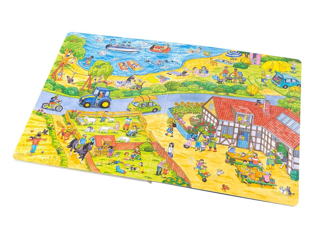 Otevři tuhle velkou obrázkovou knížku a prožij úžasný den ve městě, kde se toho od rána do večera tolik děje! Od brzkých ranních hodin se v ulicích činí popeláři, kteří se svým vozem vyvážejí plné popelnice. Čas vstát z postele, vyčistit si zuby a nasnídat se. A pak hurá do školky! Je třeba také vyřídit nákupy. Hasiči a policisté jsou v pohotovosti, na stavbě panuje čilý ruch. I v parku to žije – děti i dospělí se tu baví, pochutnávají si na zmrzlině nebo jen tak odpočívají… A co takhle krátký výlet za vodními hrátkami k jezeru či na blízkou farmu za zvířátky? Večer se pak všichni vracejí do svých domovů, aby se unavení po vzrušujícím dni uložili do postýlek a postelí. Sladké sny!