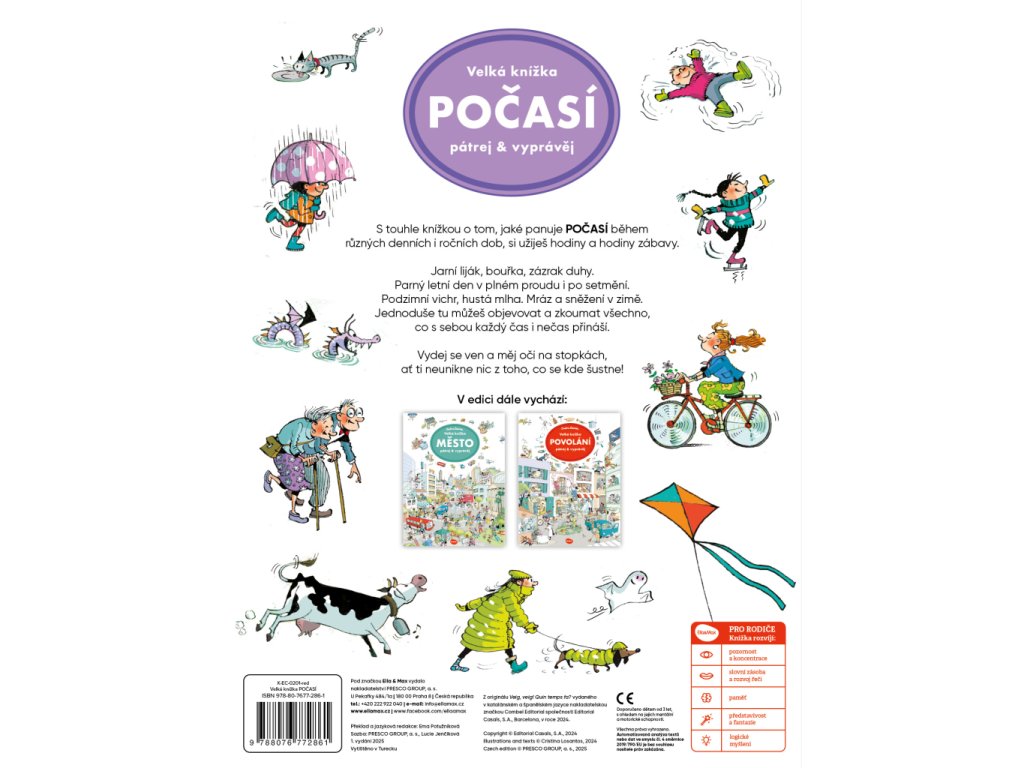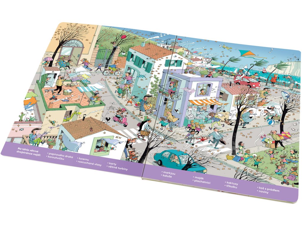 S touhle knížkou o tom, jaké POČASÍ panuje během různých denních i ročních dob a také jak si s námi může pěkně pohrát, si užijete dlouhé hodiny zábavy! Objevíte tu spoustu příběhů s dobrým koncem, ale i řadu neslavných příhod. Mějte oči na stopkách! Každá stránka je plná detailních barevných obrázků, v nichž lze donekonečna objevovat vždy nové a nové věci, vtípky, postavy i jejich dobrodružství. Řada z nich je úplně obyčejných, ale mnohé jsou tak neobvyklé, že je lze spatřit nebo prožít právě jen na stránkách tohohle krásného velkoformátového leporela.