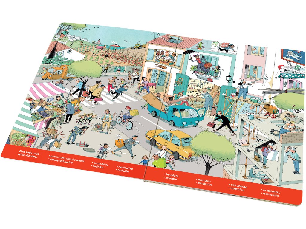 S touhle knížkou o tom, jakým POVOLÁNÍM a činnostem se lidé věnují, si užijete dlouhé hodiny zábavy! Poznáte, jaká řemesla lidé provozují nebo kam chodí do zaměstnání. Najdete tu spoustu příběhů s dobrým koncem, ale i řadu neslavných příhod. Mějte oči na stopkách! Každá stránka je plná detailních barevných obrázků, v nichž lze donekonečna objevovat vždy nové a nové věci, vtípky, postavy i jejich dobrodružství. Řada z nich je úplně obyčejných, ale mnohé jsou tak neobvyklé, že je lze spatřit nebo prožít právě jen na stránkách tohohle krásného velkoformátového leporela.