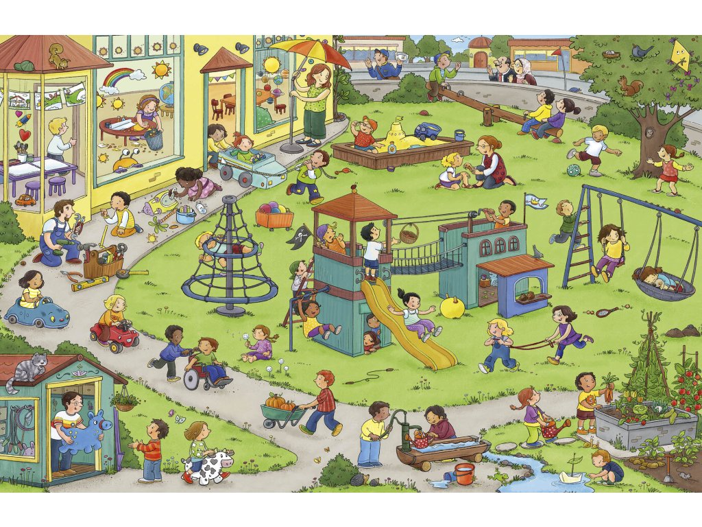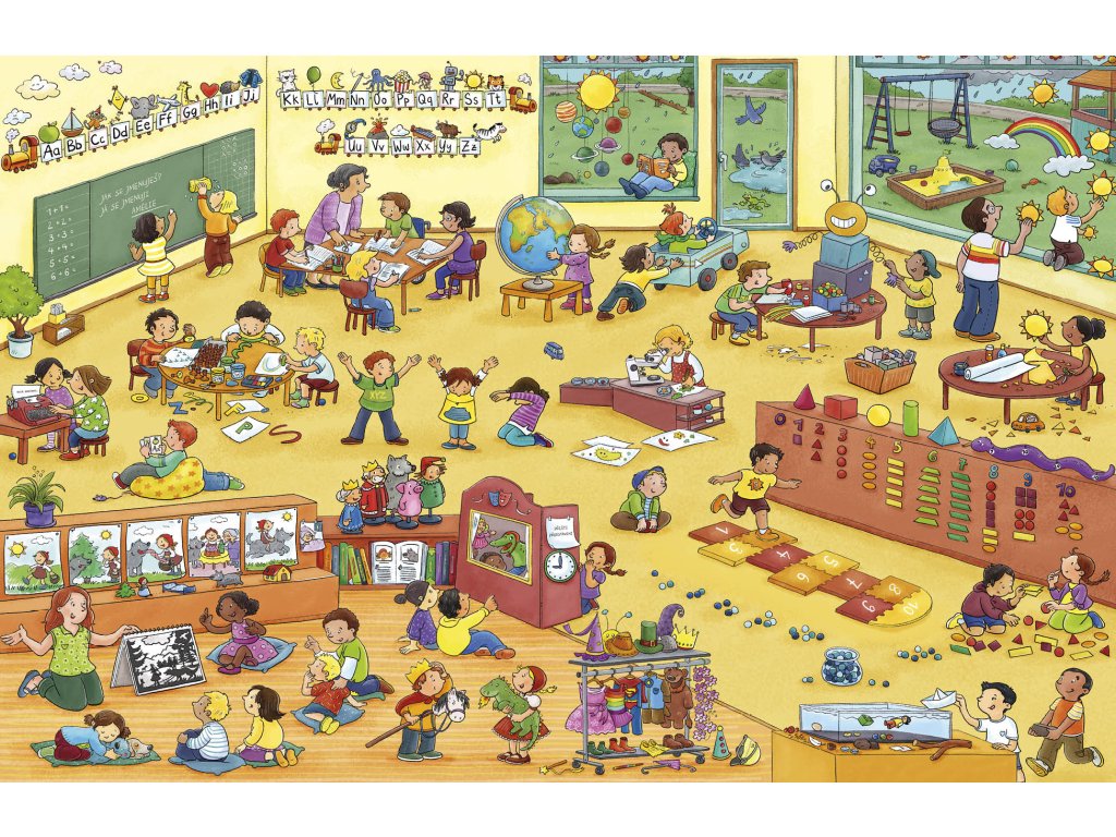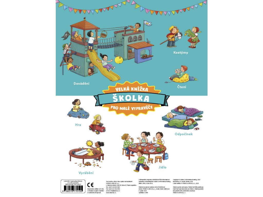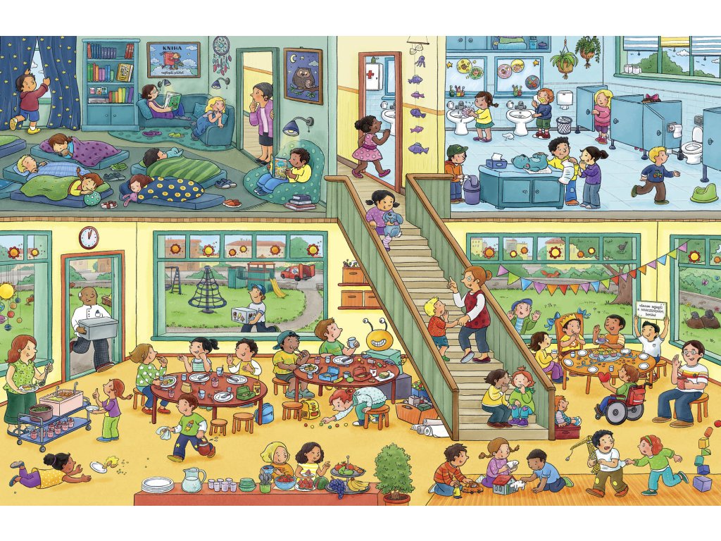 S touhle velkou obrázkovou knížkou prožijete úžasný den v mateřské školce, kde je pořád živo! Ráno sem děti doprovodí maminky a tatínkové a pak teprve začne ta pravá zábava! Někdo si hraje, někdo tvoří, jiní se učí, zpívají nebo třeba cvičí. A pak všichni hurá ven – i tam totiž čeká spousta dobrodružství… Co takhle krátký výlet za zvířátky na farmu? Zapomenout nesmíme ani na povinnosti: pěkně se společně najíst, umýt a jít si po obědě zdřímnout. Zítra se pak můžeme těšit na další setkání s kamarády. I malí čtenáři mohou prožívat školková dobrodružství znovu a znovu – stačí otevřít knížku a začít listovat od začátku!
