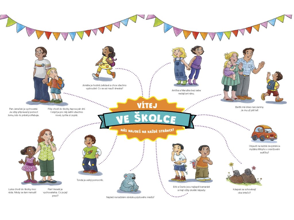 S touhle velkou obrázkovou knížkou prožijete úžasný den v mateřské školce, kde je pořád živo! Ráno sem děti doprovodí maminky a tatínkové a pak teprve začne ta pravá zábava! Někdo si hraje, někdo tvoří, jiní se učí, zpívají nebo třeba cvičí. A pak všichni hurá ven – i tam totiž čeká spousta dobrodružství… Co takhle krátký výlet za zvířátky na farmu? Zapomenout nesmíme ani na povinnosti: pěkně se společně najíst, umýt a jít si po obědě zdřímnout. Zítra se pak můžeme těšit na další setkání s kamarády. I malí čtenáři mohou prožívat školková dobrodružství znovu a znovu – stačí otevřít knížku a začít listovat od začátku!