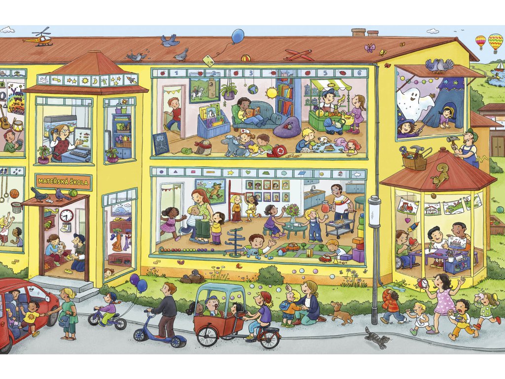 S touhle velkou obrázkovou knížkou prožijete úžasný den v mateřské školce, kde je pořád živo