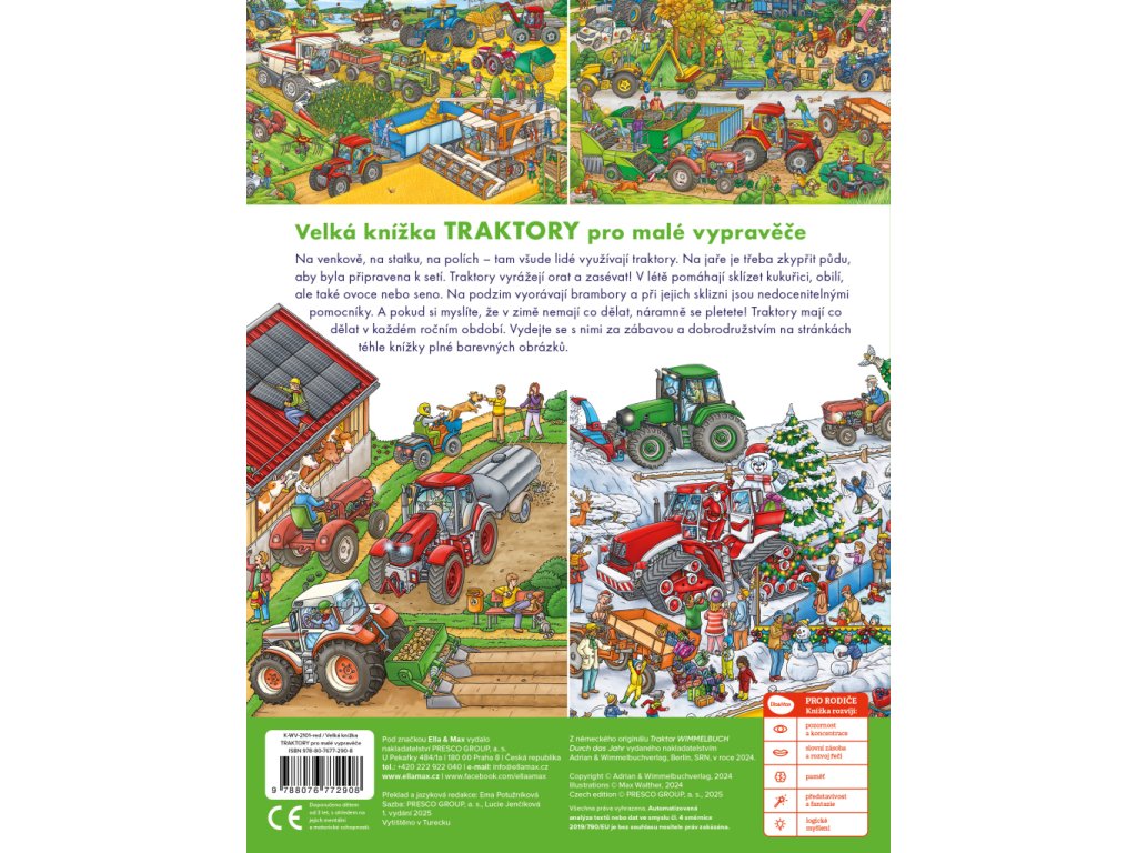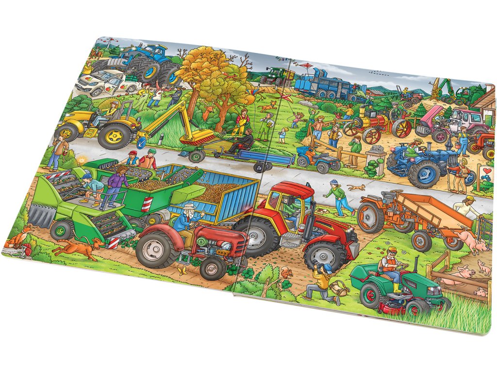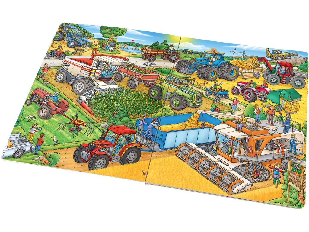 Traktory a další zemědělské stroje mají co dělat v každém ročním období. Díky detailním ilustracím se s nimi můžete vydat za prací, ale i zábavou také vy! Zjistěte, jak pomáhají na venkově, na statku, na polích, zkrátka všude tam, kde je lidé využívají. Sledujte příběhy, které se rozehrávají na stránkách tohoto úžasného velkoformátového leporela, a zažívejte dobrodružství s hrdiny a jejich stroji, které můžete na každé dvojstraně hledat znovu a znovu. Stačí se jen ponořit do barevného světa obrázků a pozorně se dívat…