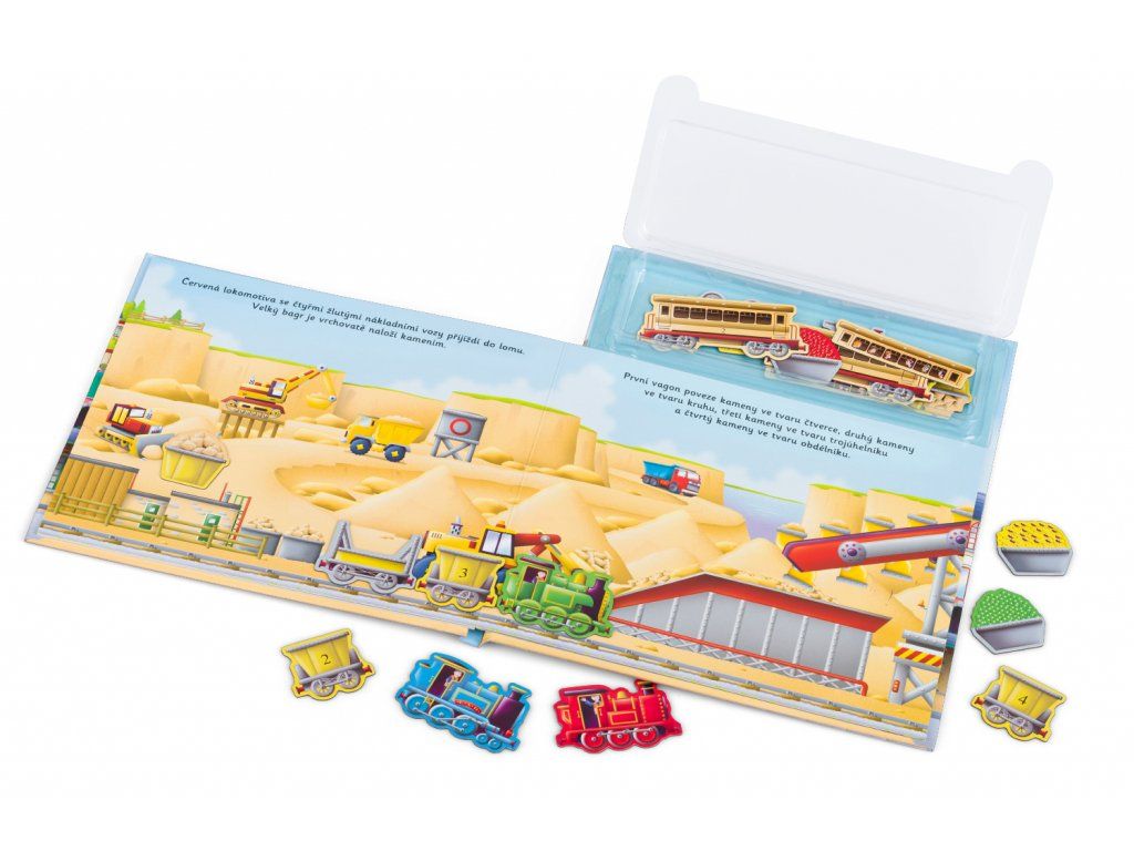Húúú, húúú – pozor, přijíždí vlak! V přístavu, na vlakovém nádraží, na stavbě a po náročném dni v depu – tam všude najdeme lokomotivy a vagony pro osobní nebo nákladní přepravu. Tam všude nám vláčky pomáhají. Na každé stránce téhle knížky objeví děti kratičký příběh, který mohou spoluvytvářet pomocí magnetek. A až si do sytosti vyhrají, mohou všechny vozy zase „zaparkovat“ zpátky do úložného boxu, kde budou připraveny na další skvělou zábavu.