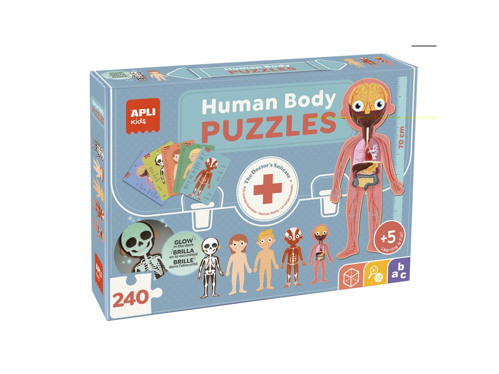 Obsahuje 5 puzzle ve tvaru lidského těla, 15 pracovních listů s podrobnými informacemi ve 12 různých jazycích.