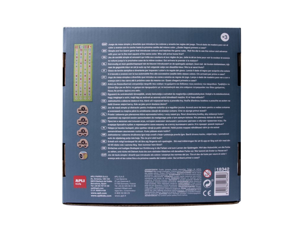 Zábavná a zároveň jednoduchá desková hra, která přináší barvy a učí respektovat pravidla hry. Obsahuje hrací desku, 4 dřevěné dílky ve tvaru auta a 1 barevnou kostku.